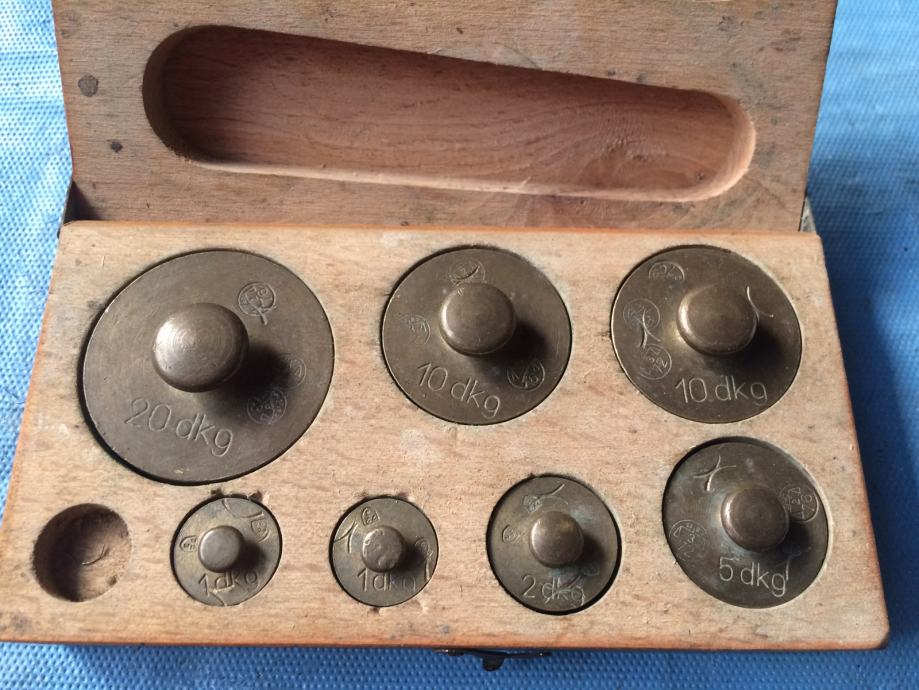 Prodajem set ljekarskih utega u originalnoj drvenoj kutiji.