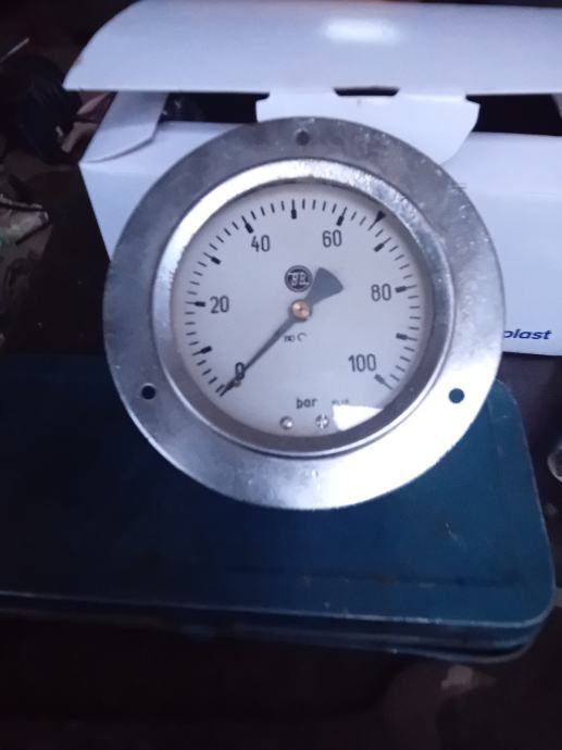 Prodajem rabljeni manometar s mjernim rasponom do 100 bara. Radi se o profesionalnom mjernom instrumentu solidne izrade, s metalnim kućištem i pločicom s jasno označenom skalom u barima.