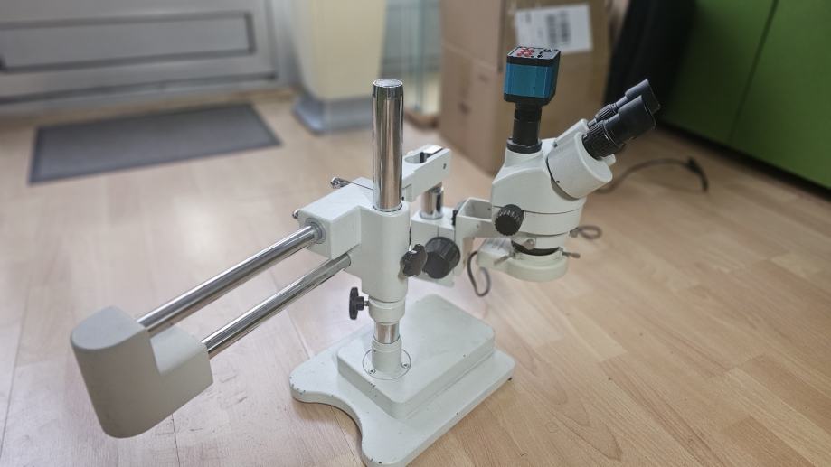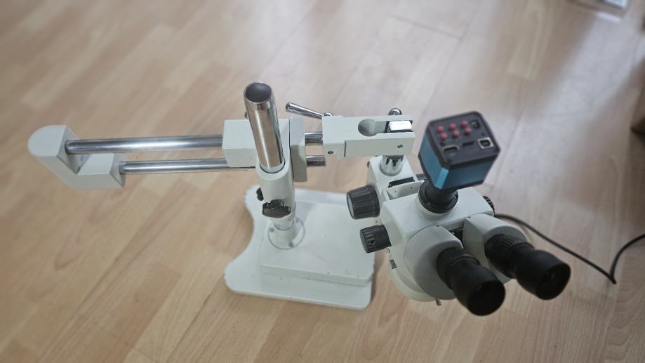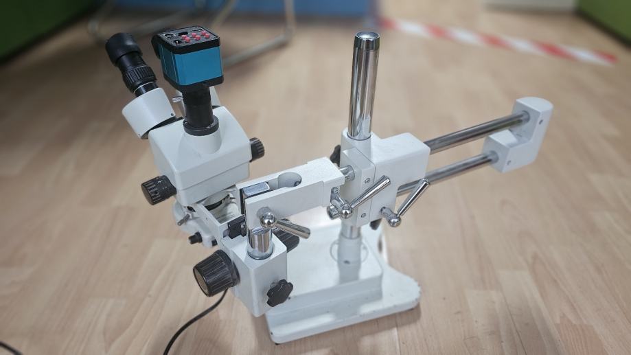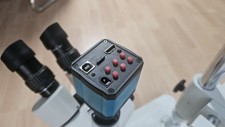 Malo korišten, profesionalni mikroskop sa dodatnom HDMI kamerom koja omogućava spajanje na monitor ili TV i pregledavanje na velikom ekranom. Isto tako je moguće slike spremati na memorijsku karticu koju poklanjam uz mikroskop.