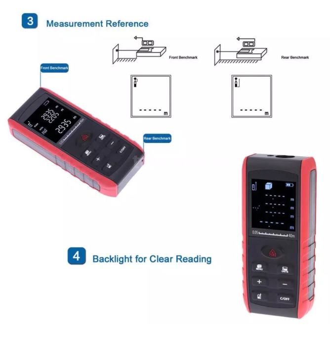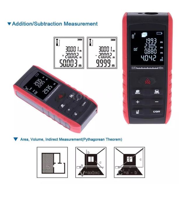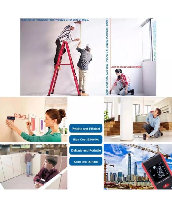 Mjerač laser udaljenost s velikom preciznošću može se koristiti za mjerenje udaljenosti, površine i volumena. Također se može upotrijebiti za neizravno mjerenje po Pitagorin poučak. Proizvod je prenosiv i pouzdan u mjerenju, što vaš mjerenja točniji, jednostavno i brže. Mjerač se može naširoko koristi u građevinarstvu i industriji, posebno u velikim prostorima kao što su sobe, apartmani, zgrada, nekretnine, tvornice, itd