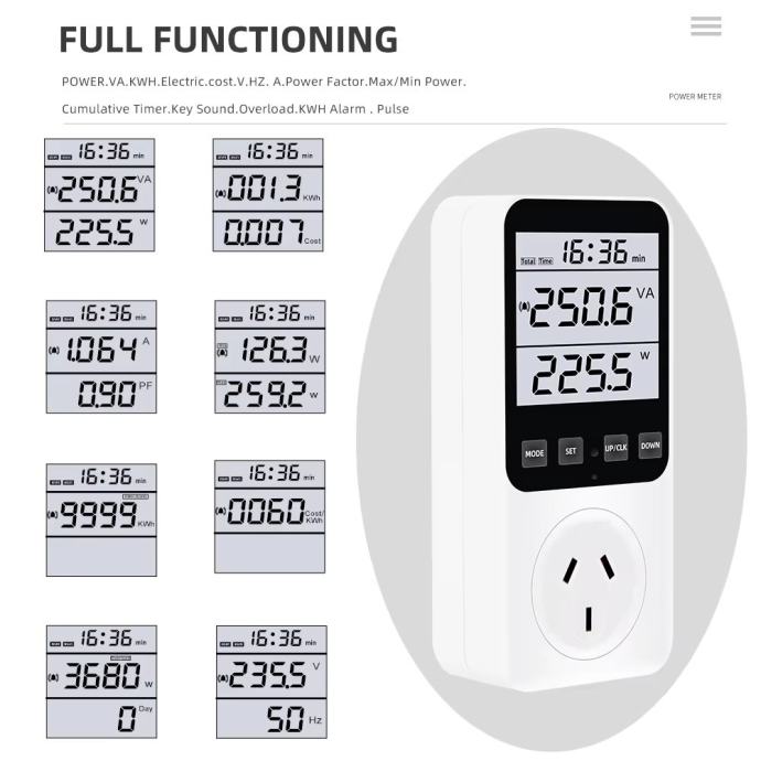 - mjeri snagu bilo kojeg priključenog električnog uređaja,