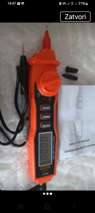 Prodajem novi mjerni instrument tipa pen multimetar u narančastoj boji. Radi se o kompaktnom uređaju u obliku olovke s digitalnim zaslonom i tipkama HOLD, RANGE i SELECT. Dolazi s mjernim kabelima, dodatnim vrhovima