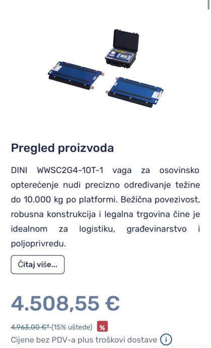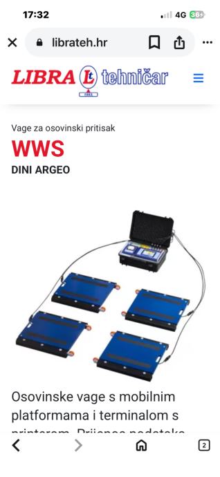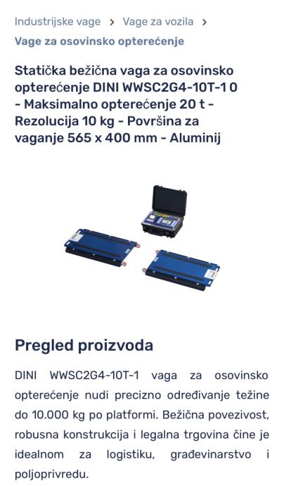 Prodajem doslovno kao NOVU!!!mobilnu Osovinsku vagu s mobilnim platformama i terminalom s printerom /WI-FI. Prijenos podataka spojnim kablom, žično spajanje platformi s terminalom touch screen, za vaganje do Max. 40 tona na 4 platforme, svaka do Max. 10T.