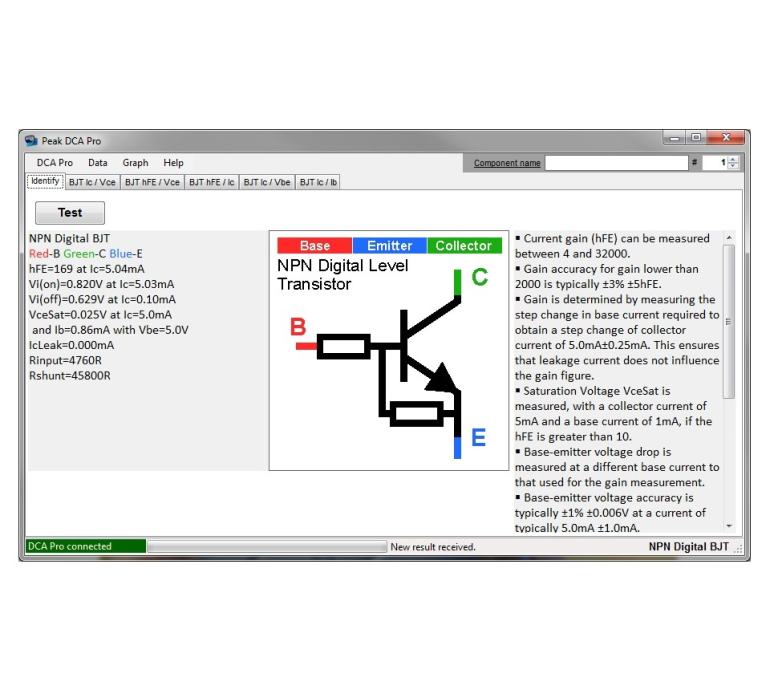 Takoder povezivanjem komponente na tester prikazuju se pinovi komponente, mjeri se ispravnost komponente i prikazu se na grafickom ekranu i preko USB konekcije na racunalu parametri.
