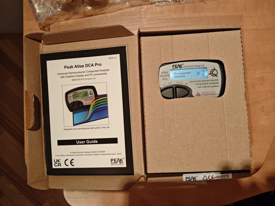 Uredjaj dolazi sa originalnom kutijom, uputstvima (preko 20 stranica!), usb kablom koji se spaja na racunalo te usb memorijom na kojoj se nalazi windows program preko kojeg se iscrtavaju grafovi poluvodica za uparivanje i testiranje dali je komponenta ispravna ili lazna (eng. fake).