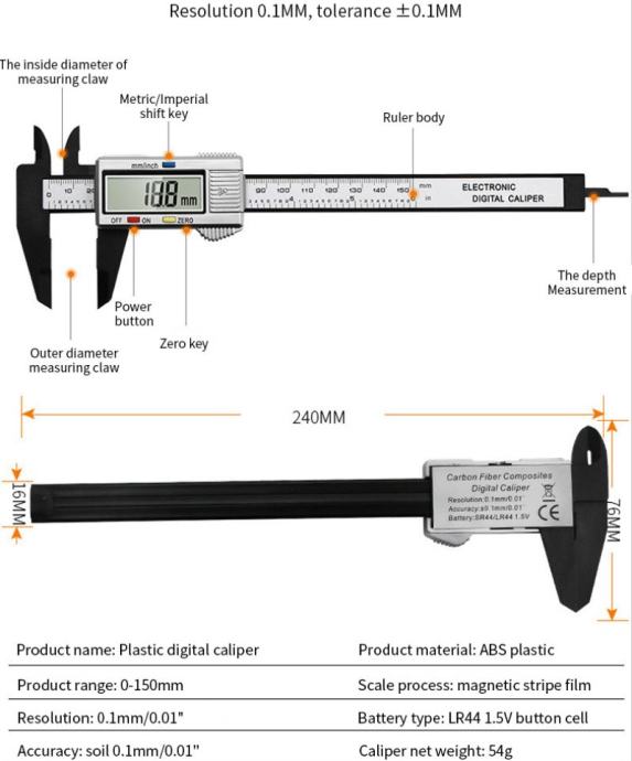 Mjerilo pomični digitalno precizno LCD 150mm, Carbon 0.1mm šubler, Electronic Caliper
