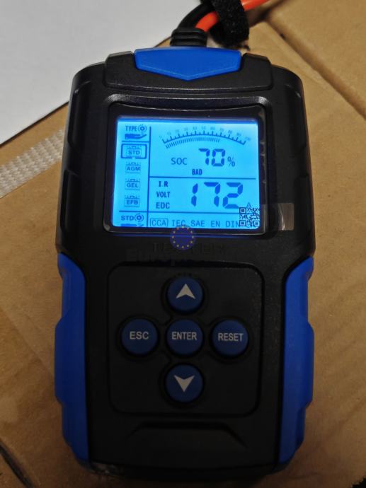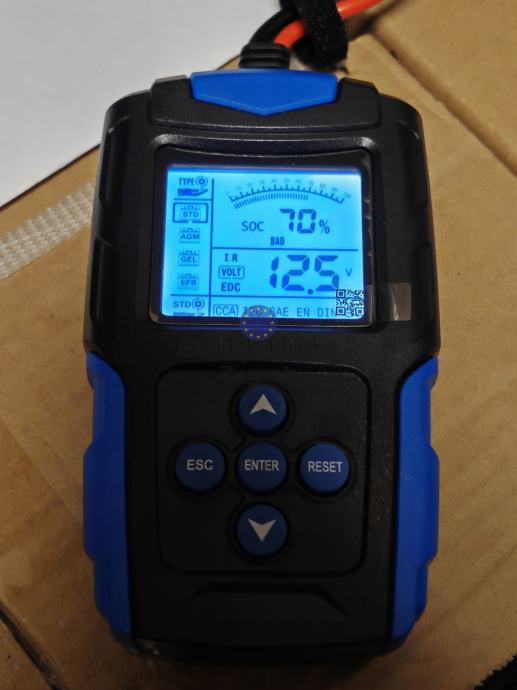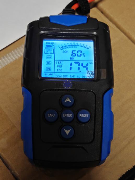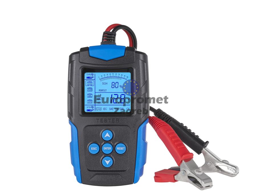 Funkcije: provjera stanja baterije (u postocima), mjerenje unutarnjeg otpora, mjerenje napona, određivanje procijenjene struje pražnjenja