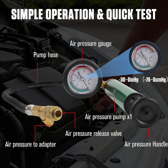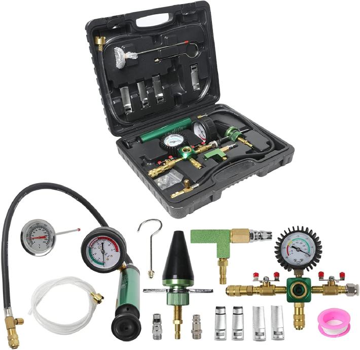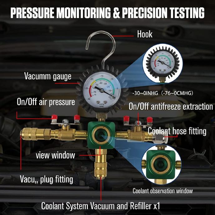 Snažna funkcija: Ovaj univerzalni komplet vakuumskog rashladnog sustava za ispitivanje tlaka hladnjaka dizajniran je da vam pomogne da jednostavno testirate propuštanje sustava hladnjaka vozila i napunite rashladnu tekućinu i uklonite mjehuriće zraka. U rashladnom sustavu stvara se vakuum koji skraćuje vrijeme punjenja rashladne tekućine, smanjuje rizik od pregrijavanja motora i održava nesmetan rad vašeg automobila.
