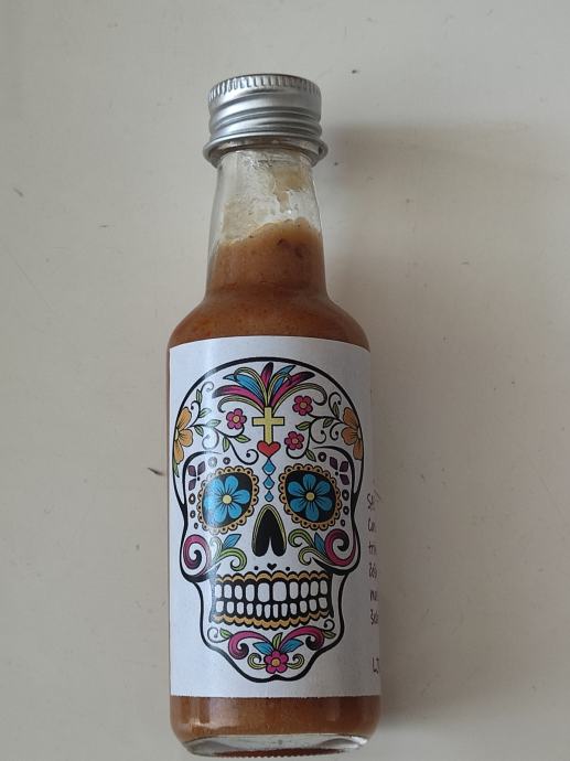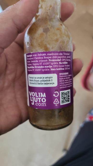 Sastav: Carolina reaper, Trinidad scorpion moruga, češnjak, lavanda, maslinovo ulje, šećer, ocat, majčina dušica.