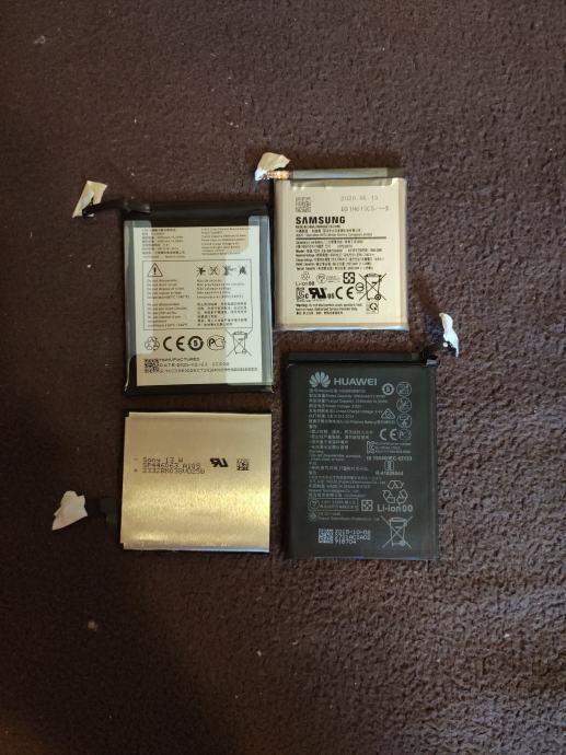 Prodajem četiri rabljene baterije za mobitele različitih proizvođača. U ponudi se nalaze baterije za Samsung i Huawei uređaje, kao i dvije baterije nepoznatih proizvođača. Sve baterije su izvađene iz uređaja i prodaju se kao dijelovi. Cijena za sve
