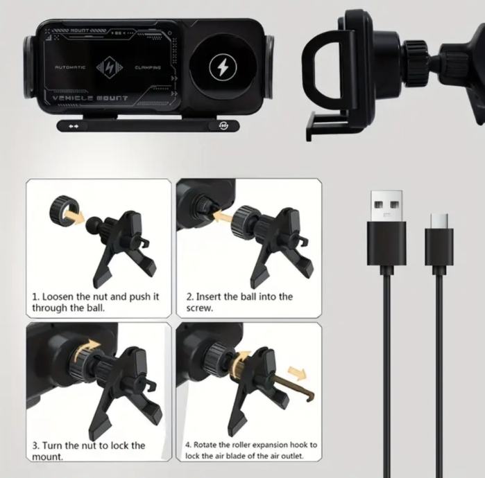 U pakiranju: 1x Auto držač s bežičnim punjenjem, 1x Nosač za ventilaciju, 1x USB-C kabel za napajanje.