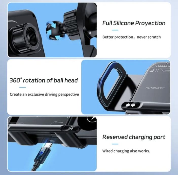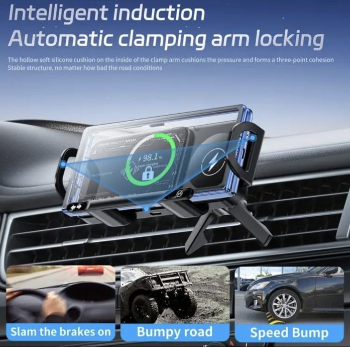 Automatsko Inteligentno Stezanje: Čim postavite mobitel, infracrveni senzor to prepoznaje i motorizirane ruke ga automatski čvrsto obujme. Sigurnost na prvom mjestu!