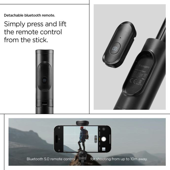 Selfie štap Spigen S541W je funkcionalan i moderan dodatak savršen za fotografiranje i snimanje videa. Opremljen neklizajućim rukohvatom sa silikonskom završnom obradom, sigurno drži vaš telefon i štiti ga od ogrebotina.