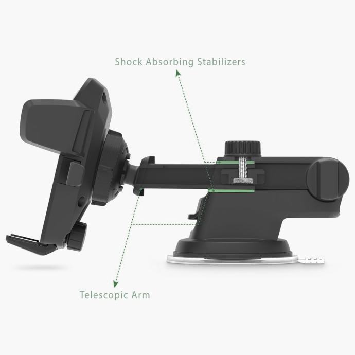 Držač koristi novu, dvostupanjsku polugu, koja omogućuje montažu držača bilo gdje na vjetrobranskom staklu, a zahvaljujući snažnoj gel vakuumskoj čašici, također i na većini ploča s instrumentima.