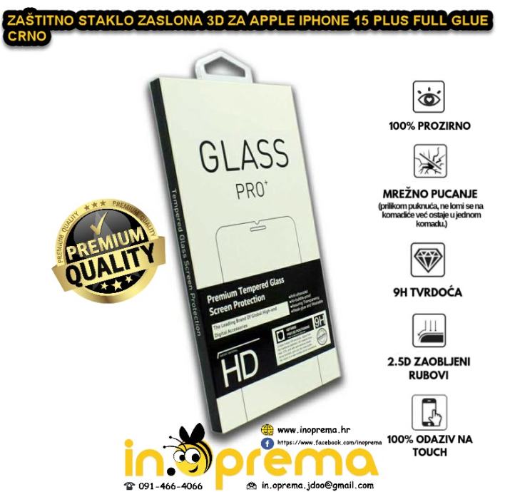 CIJENA - ZAŠTITNO STAKLO ZASLONA 3D ZA APPLE IPHONE 15 PLUS FULL GLUE CRNO - 10 EUR