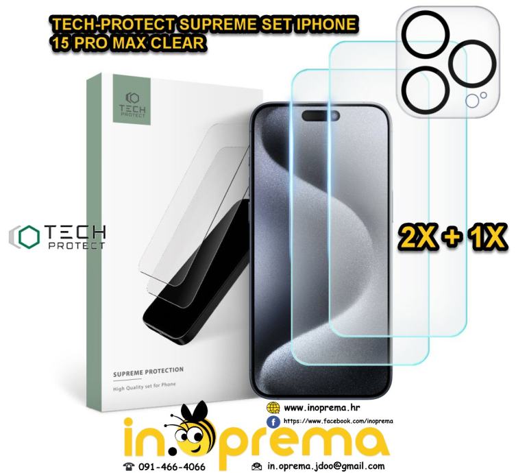 CIJENA - Tech-Protect Supreme komplet 2 kaljena stakla + zaštita za leće za iPhone 15 PRO MAX - 11.95 EUR