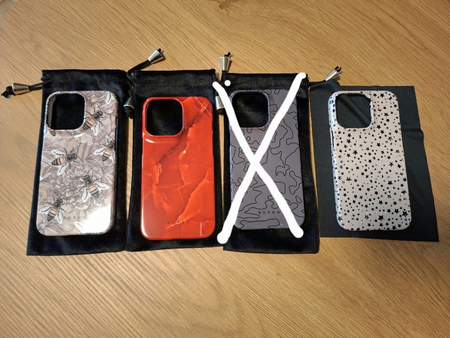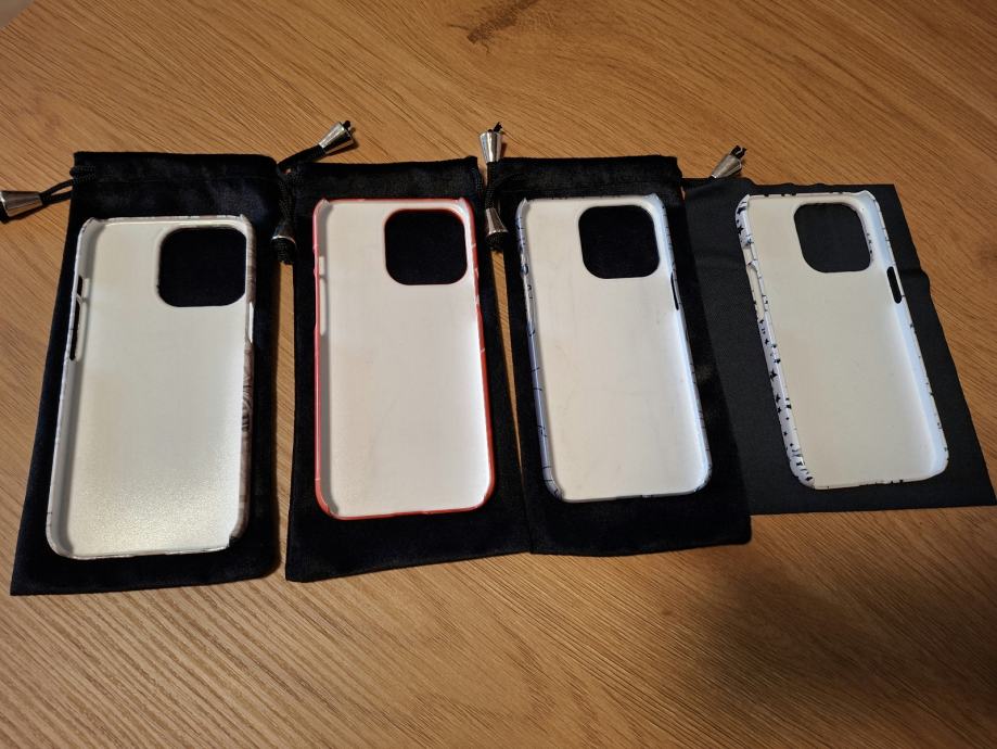 Prodajem Burga maskice za iPhone 13 Pro, ukupno sedam komada s različitim dizajnima. Svaka maskica dolazi u svojoj crnoj vrećici.