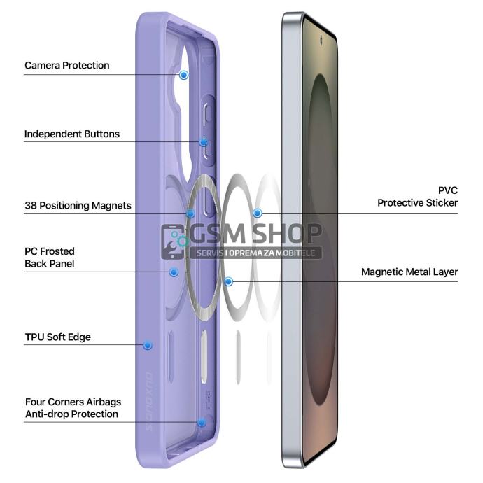 Opremljena s 38 snažnih magneta, maskica je potpuno kompatibilna s MagSafe punjačima, magnetskim auto nosačima i drugim magnetskim dodacima, osiguravajući stabilno i sigurno prianjanje. Mat završna obrada otporna je na otiske prstiju i tragove znoja, zadržavajući uredan izgled kroz dugotrajnu upotrebu.