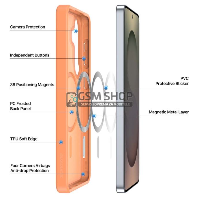 Opremljena s 38 snažnih magneta, maskica je potpuno kompatibilna s MagSafe punjačima, magnetskim auto nosačima i drugim magnetskim dodacima, osiguravajući stabilno i sigurno prianjanje. Mat završna obrada otporna je na otiske prstiju i tragove znoja, zadržavajući uredan izgled kroz dugotrajnu upotrebu.