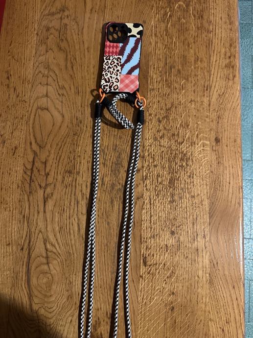 Prodajem novu maskicu za iPhone 16 Pro Max. Maskica dolazi s remenom (crossbody trakom) koji omogućuje nošenje mobitela oko vrata ili preko ramena. Dizajn je šaren, s kombinacijom životinjskih uzoraka poput leoparda i zebre te karirastih i geometrijskih elemenata u nijansama ružičaste, plave, crne i bijele boje. Remen je crno-bijeli, s narančastim metalnim spojnicama.