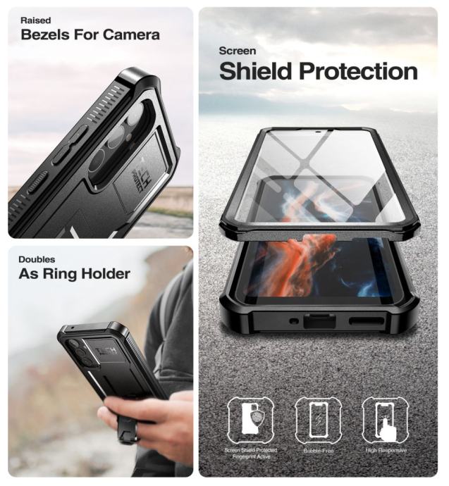 Dvodijelna torbica kombinira tvrdi stražnji oklop izrađen od PC školjke i TPU otpornog na udarce. Dodatno pojačanje u kutovima – zaštitni zračni jastuci – učinkovito apsorbiraju svaki pad. Prednja strana uređaja prekrivena je okvirom s integriranim polikarbonatnim pokrovom. Ovo rješenje savršeno odvaja zaslon, štiteći ga od ogrebotina.