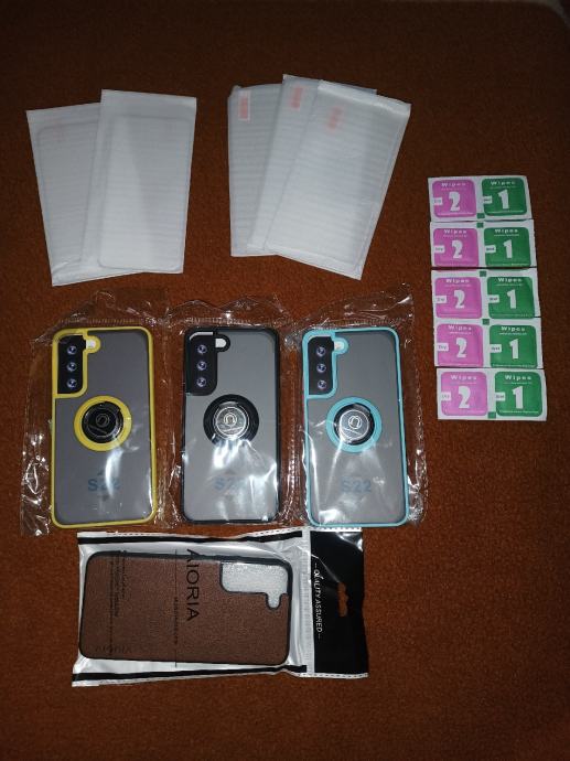 Za SAMSUNG GALAXY S22, prodajem 4 nove zapakirane maskice, 3 (crna, crno - žuta i crno plava) su sa ring standom/magnetom, jedna smeđa imitacija kože, kao i 5 novih zapakiranih kaljenih stakala (2 od ruba do ruba te 3 bez obruba) te 5 setova za čišćenje ekrana. Cijena cijelog seta je 20 €, a pojedinačno po komadu 5 € (minimalno 2 komada).