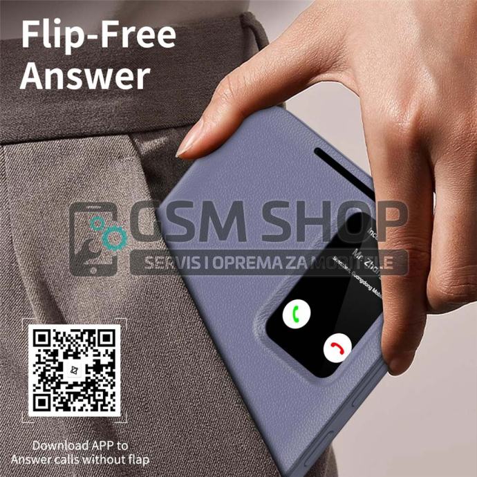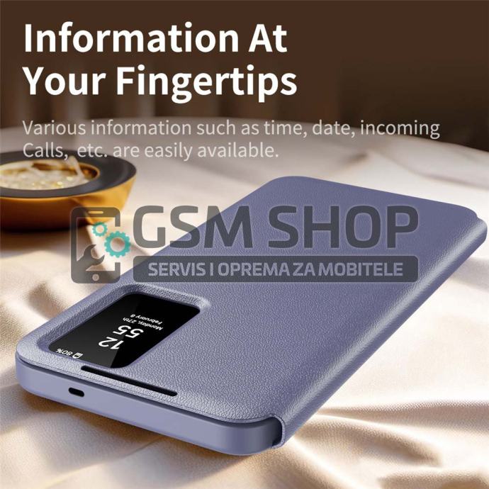 Pametni prozor omogućuje prikaz vremena, datuma i obavijesti u stvarnom vremenu te upravljanje pozivima bez otvaranja poklopca. Površina je otporna na otiske prstiju i masnoću, čime torbica zadržava uredan i sofisticiran izgled. Povišeni rubovi dodatno štite kameru i zaslon od ogrebotina i udaraca.