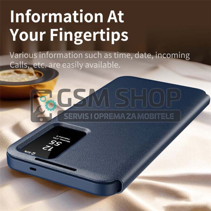 Pametni prozor omogućuje prikaz vremena, datuma i obavijesti u stvarnom vremenu te upravljanje pozivima bez otvaranja poklopca. Površina je otporna na otiske prstiju i masnoću, čime torbica zadržava uredan i sofisticiran izgled. Povišeni rubovi dodatno štite kameru i zaslon od ogrebotina i udaraca.