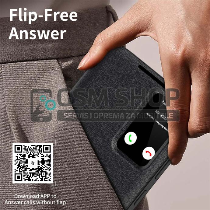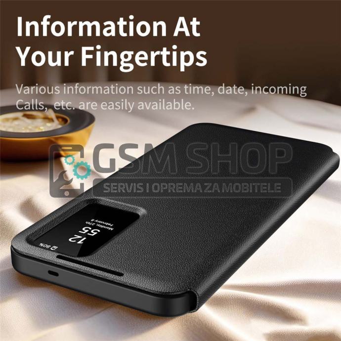 Pametni prozor omogućuje prikaz vremena, datuma i obavijesti u stvarnom vremenu te upravljanje pozivima bez otvaranja poklopca. Površina je otporna na otiske prstiju i masnoću, čime torbica zadržava uredan i sofisticiran izgled. Povišeni rubovi dodatno štite kameru i zaslon od ogrebotina i udaraca.