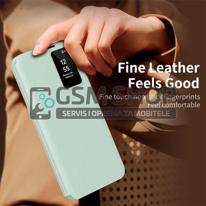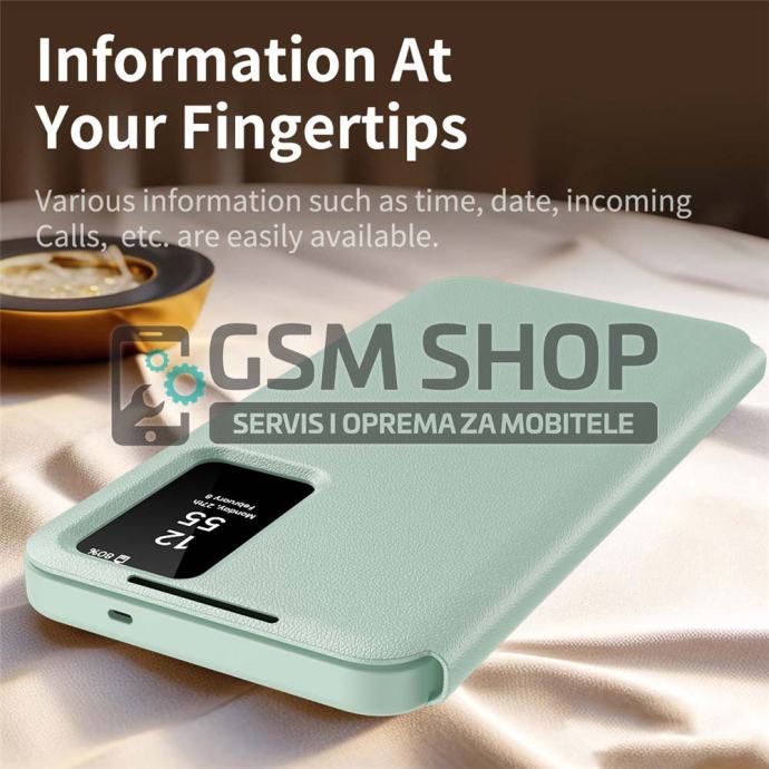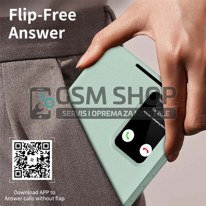 Pametni prozor omogućuje prikaz vremena, datuma i obavijesti u stvarnom vremenu te upravljanje pozivima bez otvaranja poklopca. Površina je otporna na otiske prstiju i masnoću, čime torbica zadržava uredan i sofisticiran izgled. Povišeni rubovi dodatno štite kameru i zaslon od ogrebotina i udaraca.
