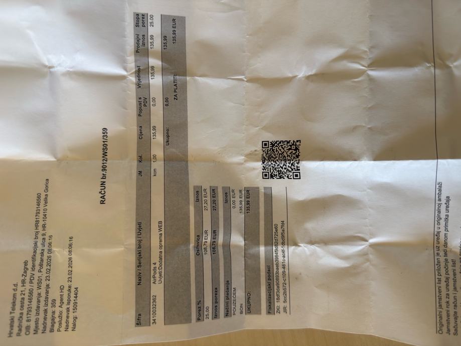 Prodajem nove Apple airpods 4 slušalice, kupio sam ih u HT-u za 135 eura. Sestri ne pašu pa ih dajem za 100, probane jednom. Ako trebate još fotki il video, slobodno pošaljite poruku, mogu i snimiti video. Radim u Zagrebu tak da ih je moguće pokupiti u Zagrebu.