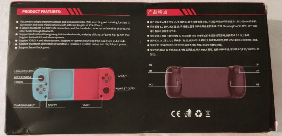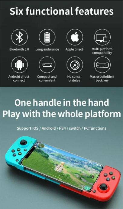 Teleskopski bluetooth kontroler za mobitel, podržava android i Iphone ios. Uz njega dolazi i original kutija. Stanje kao novo, slike su moje i pokazuju stvarno stanje kontrolera, nikakvih problema sa njim. Dobiven na dar ali mi ne treba pa je stajalo zapakirano u kutiji. Straga ima dodatne tipke koje se mogu programirati, prednje tipke svjetle ali se svjetlo može isključiti po potrebi i može raditi kao xbox ili playstation controller.