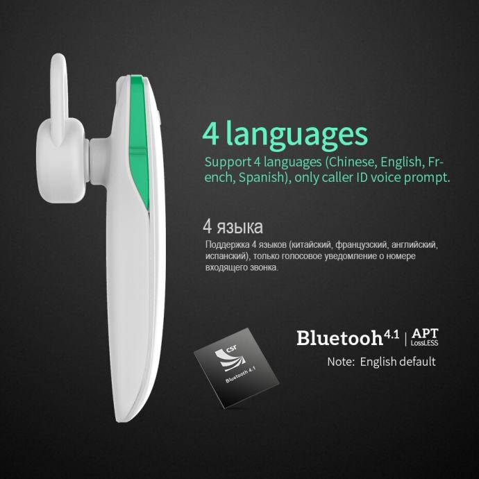 ➨ Bežična slušalica, Bluetooth v4.1, radna frekvencija 2,4 GHz, domet do 10 met., baterija Li-Polimer 50 mAh, vrijeme punjenja 1.5 h, vrijeme razgovora do 4 sati, reprodukcija glazbe do 3 sata, vrijeme na čekanju do 55 sati