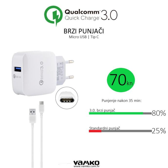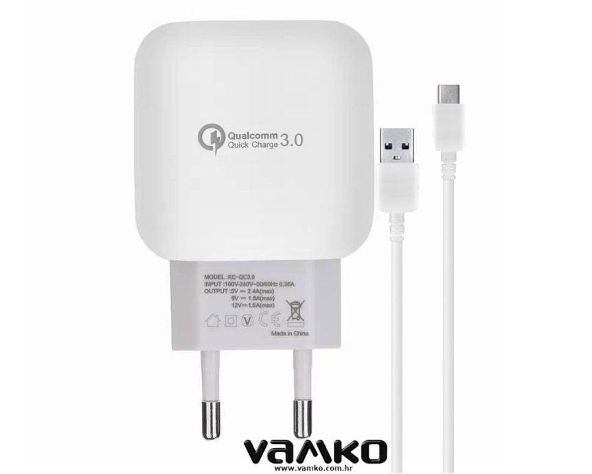 Brzi punjač (fast charger) Qualcomm 3.0. + usb data kabel type C (tip C) za Samsung, Huawei, Xiaomi modele