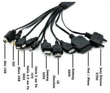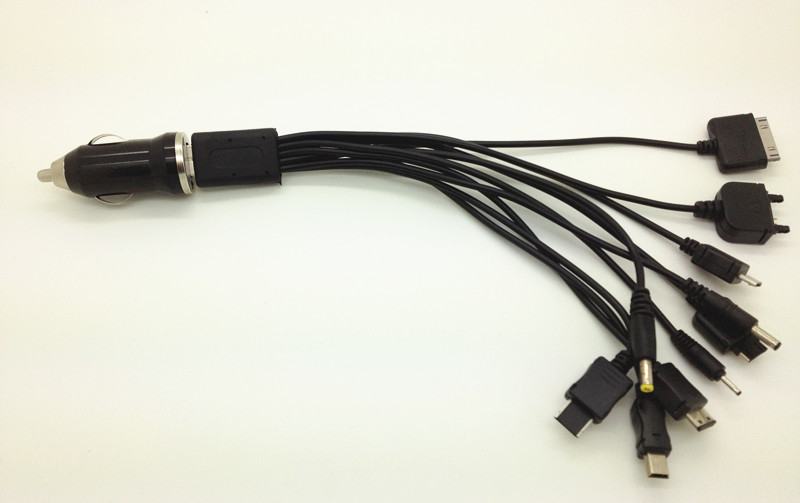- priključci: okrugli priključak od 2mm, 3mm i 4mm promjera (za Nokia, PSP &...), LG priključak, mini USB priključak, micro USB priključak, Samsung x 2 priključci za stare i nove modele, Sony Ericsson priključak i Apple Dock priključak.