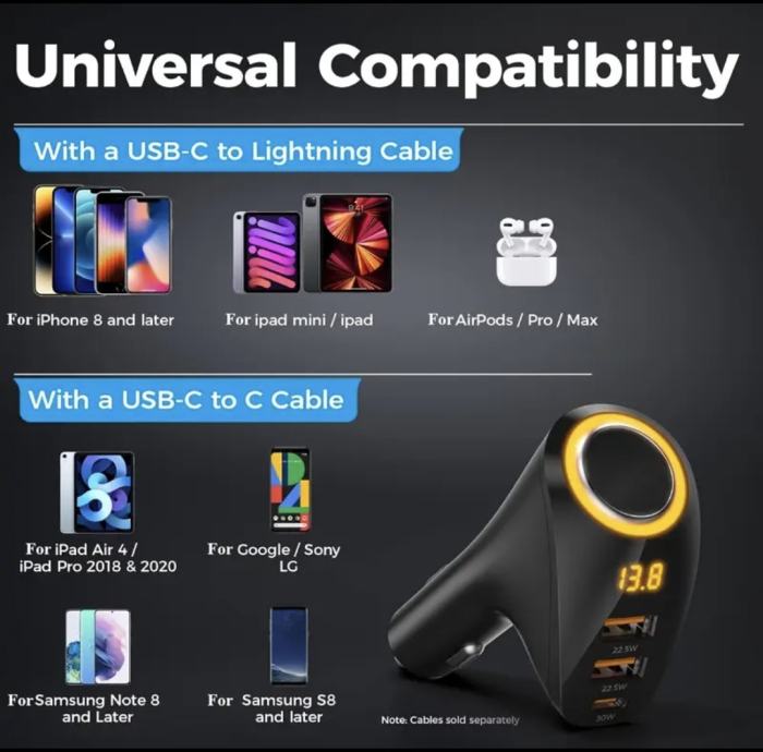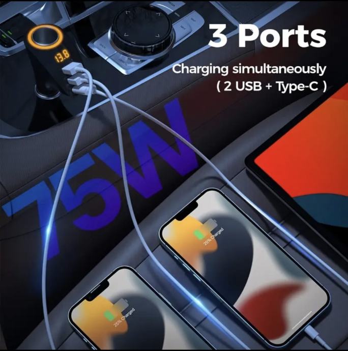 Najveća snaga 175W, 4 u 1 punjač za auto s dvostrukim USB priključkom tipa C s prikazom napona, 75W 4 porta brzog punjenja za iPhone, iPad, za Galaxy.