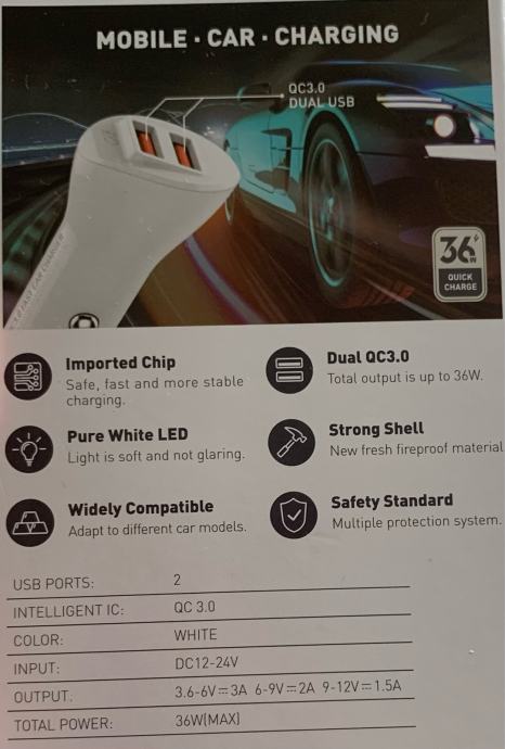 Potpuno novi, nekorišteni auto punjač, 36W, 2x USB, Quick charge 3.0.