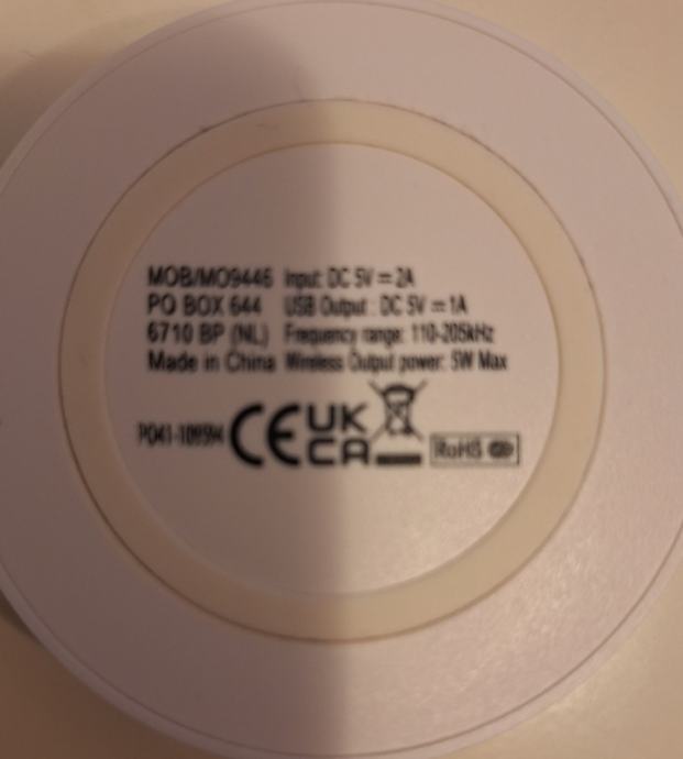 Bežićni punjač za mobitel, input DC 5 V, 2 A, output DC 5 V, 1 A, output power 5 W.