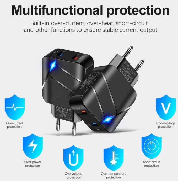 Punjač 28W brzi kućni QC3.0 USB 3A +2.1A iPhone 10 11 12 14 Samsung
