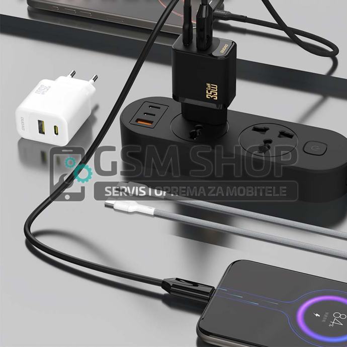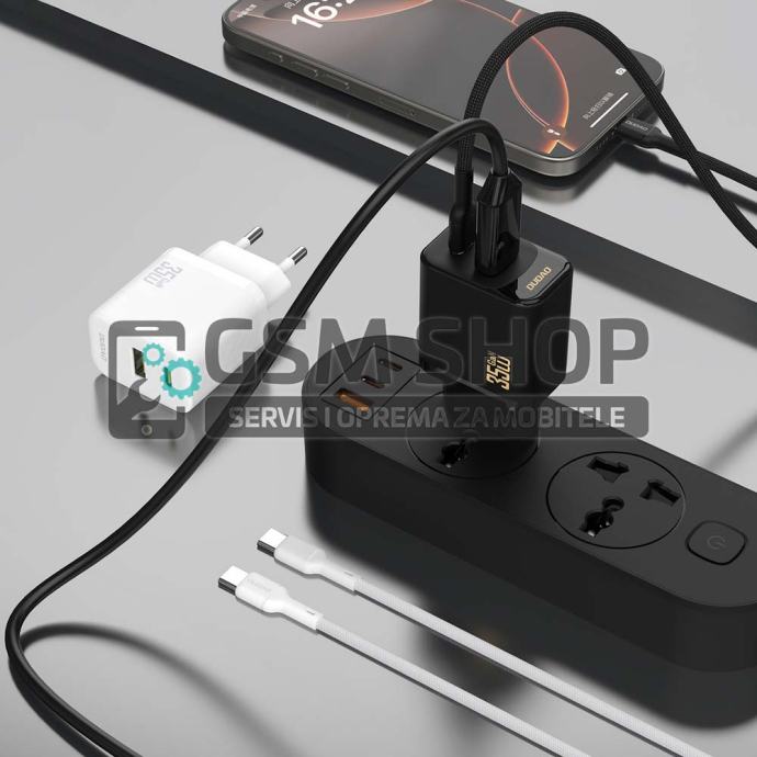 Opremljen s dva izlazna porta – USB-C i USB-A – omogućuje istovremeno punjenje dva uređaja. U pakiranju se nalazi i USB-C kabel duljine 1 m koji podržava brzo punjenje i prijenos podataka, tako da je punjač spreman za korištenje odmah po vađenju iz kutije.
