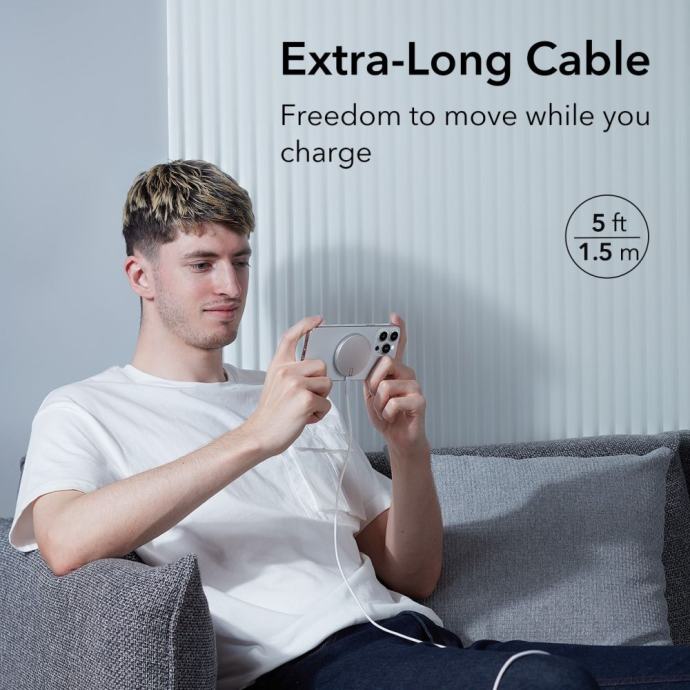 ESR HaloLock Mini punjač dizajniran je za snagu i izdržljivost. Dugi kabel od 1,5 metara omogućuje vam korištenje telefona čak i tijekom punjenja, osiguravajući slobodu kretanja, a ojačana baza i izdržljivo kućište od najlonske pletenice osiguravaju da će kabel ostati u izvrsnom stanju.
