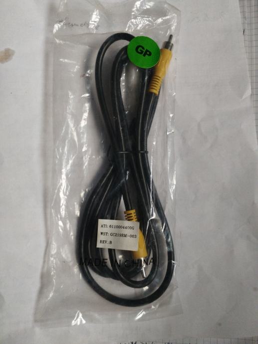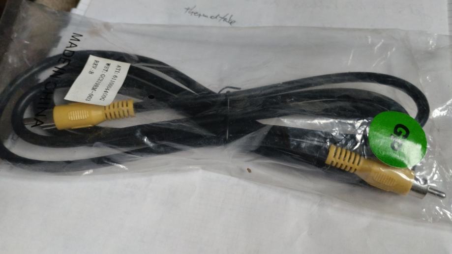 Kompozitni RCA video kabel, zapakiran i nekorišten. Crne je boje s konektorima u žutoj boji.