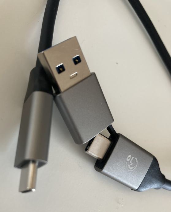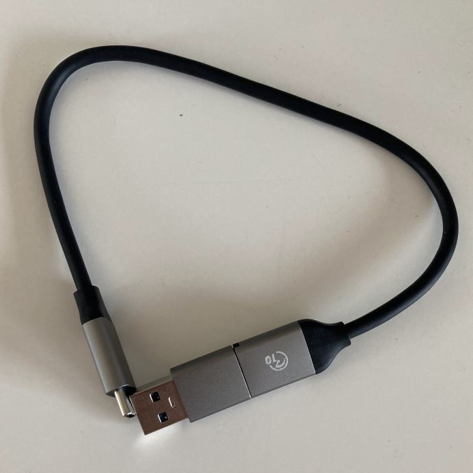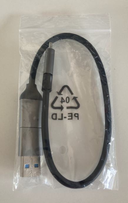 Potpuno novi, nekorišteni kabel USB-C na USB-C s adapterom na USB-A. Adapter je prikačen na kabel tako da se ne može izgubiti. Idealan prijenosni kabel.