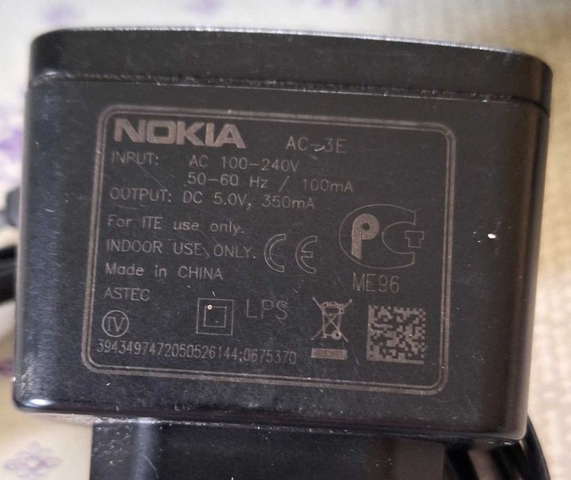 Tip punjača je AC-3E, ulaz 110-220 V AC, izlaz 5V DC 350 mA.