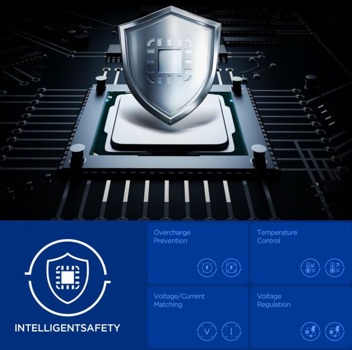 Quantum Boost tehnologija automatski prilagođava snagu punjenja spojenom uređaju, maksimizirajući njegovu učinkovitost. Ugrađene značajke sprječavanja prekomjernog punjenja, usklađivanja napona i regulacije napona štite uređaje od prekomjernog punjenja, prekomjernog napona i nestabilne struje, osiguravajući sigurno i stabilno punjenje u svim uvjetima.