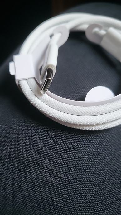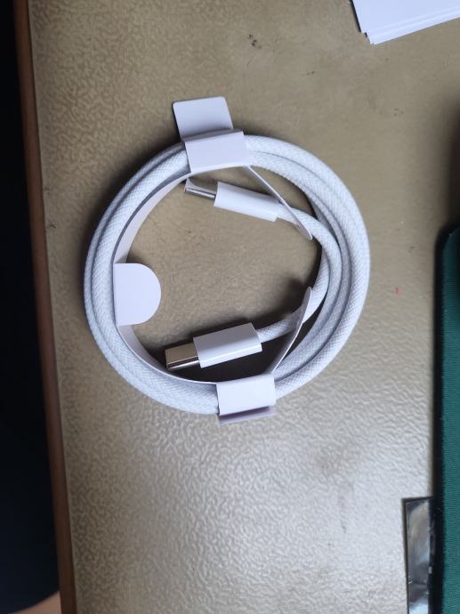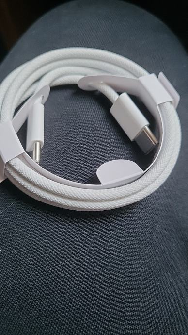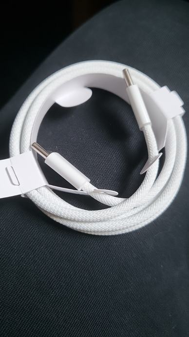 Prodajem pleteni USB-C na USB-C kabel duljine 1 metar u bijeloj boji. Kabel ima pletenu oplatu koja pruža bolju izdržljivost u usporedbi s običnim gumenim kabelima. Na oba kraja nalazi se USB-C priključak.