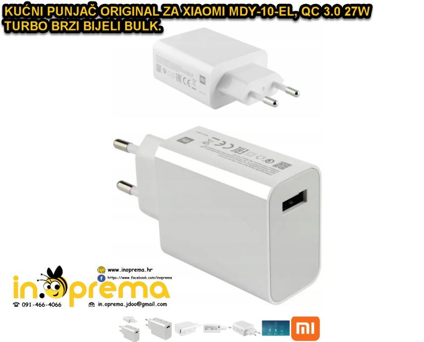 CIJENA - KUĆNI PUNJAČ ORIGINAL ZA XIAOMI MDY-10-EL, QC 3.0 27W TURBO BRZI BIJELI BULK. - 15.50 EUR