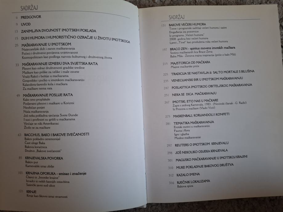 Bogato ilustrirana monografija o pokladama u Imotskome sadrži povijesni pregled maskiranja, opis samog Bakovog pokladnog ceremonijala i povorke, teme i programe "Večeri humora" koje se održavaju u tom ozračju, a izdvojeni su i maštoviti sudionici imotskih poklada. Pojedina su poglavlja posvećena djeci u maškarama, člancima objavljenim u tisku, te tematici maskiranja. Na kraju je objavljeno kazalo imena i rječnik lokalizama.