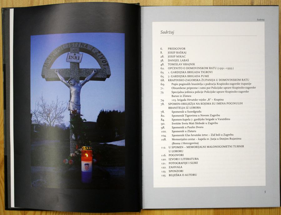 Knjiga autora Vladimira Matejaša o poginulim braniteljima iz Hrvatskog zagorja, tj. Krapinsko-zagorske županije, a opsežno o onima iz Lobora – Josip Raškaj, Josip Mikac, Danijel Labaš i Tomislav Krajnik. Također se u knjizi obrađuju brigade u kojima su Zagorci sudjelovali, spomenici, udruge itd. Preko 120 stranica u boji na kvalitetnom papiru, tvrde korice, VRLO RIJETKO!