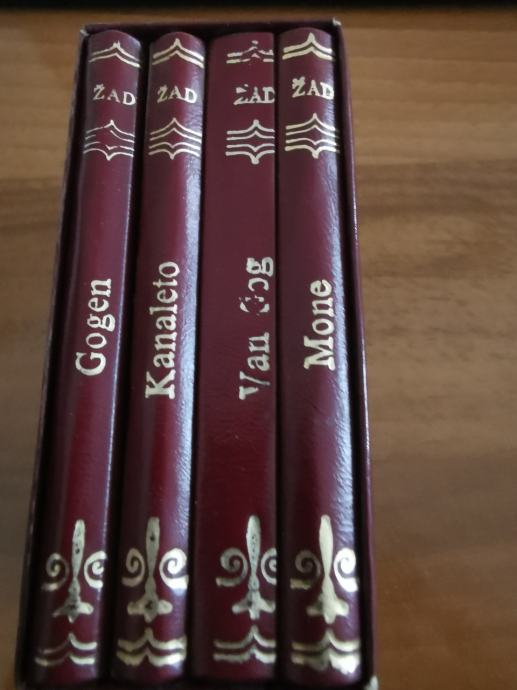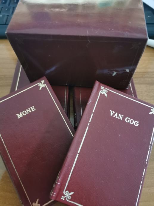 Džepna kolekcija monografija najpoznatijih likovnih umjetnika, nova. Van Gogh, Monet, Gogen, Kanaletto, u kutijici. Dimenzije 70x105 mm, biblioteka Žad, 1988. god. izdavač Vuk Karadžić, Beograd. Tvrdi uvez sa kvalitetnim papirom, sa 156 stranica. ...za ljubitelje prave umjetnosti. Odlično očuvano